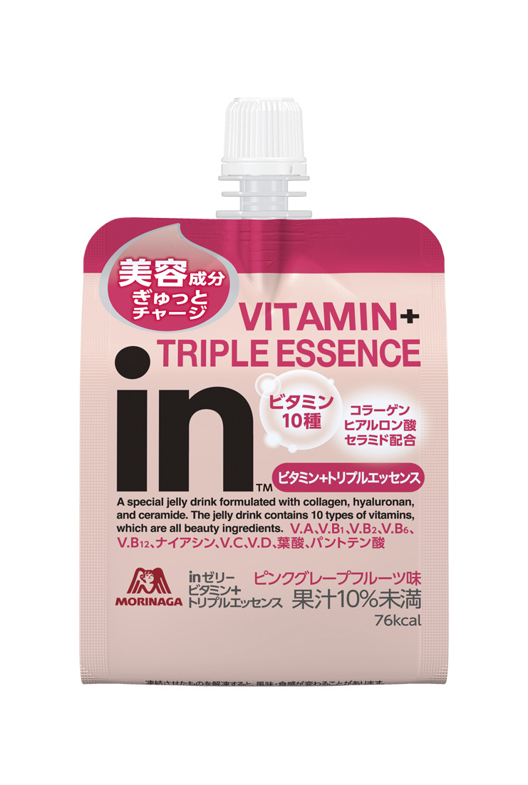 ビタミン10種にプラスし、inゼリーで初めて、コラーゲン・ヒアルロン酸・セラミドの3種がまとめて配合されています。