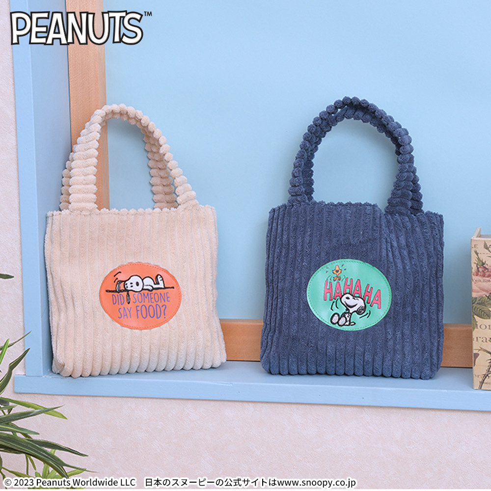 トレンドのコーデュロイ生地がおしゃれな「スヌーピー」のトートバッグ。