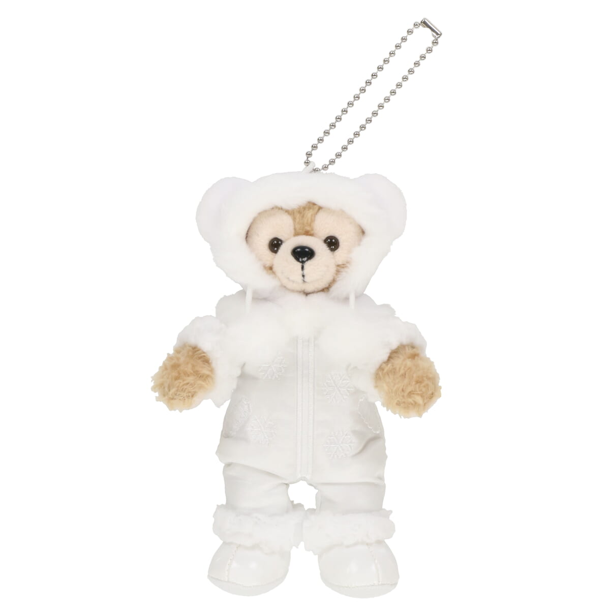 雪をイメージした、真っ白なコスチュームを身にまとった「ダッフィー&フレンズ」のぬいぐるみバッジ。