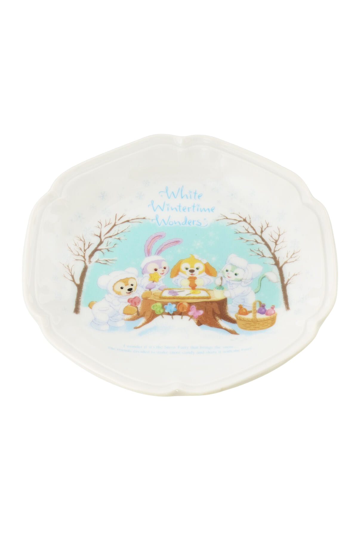 雪の中でキャンディー作りを楽しむ「ダッフィー」「ジェラトーニ」「ステラ・ルー」「クッキー・アン」のデザイン。