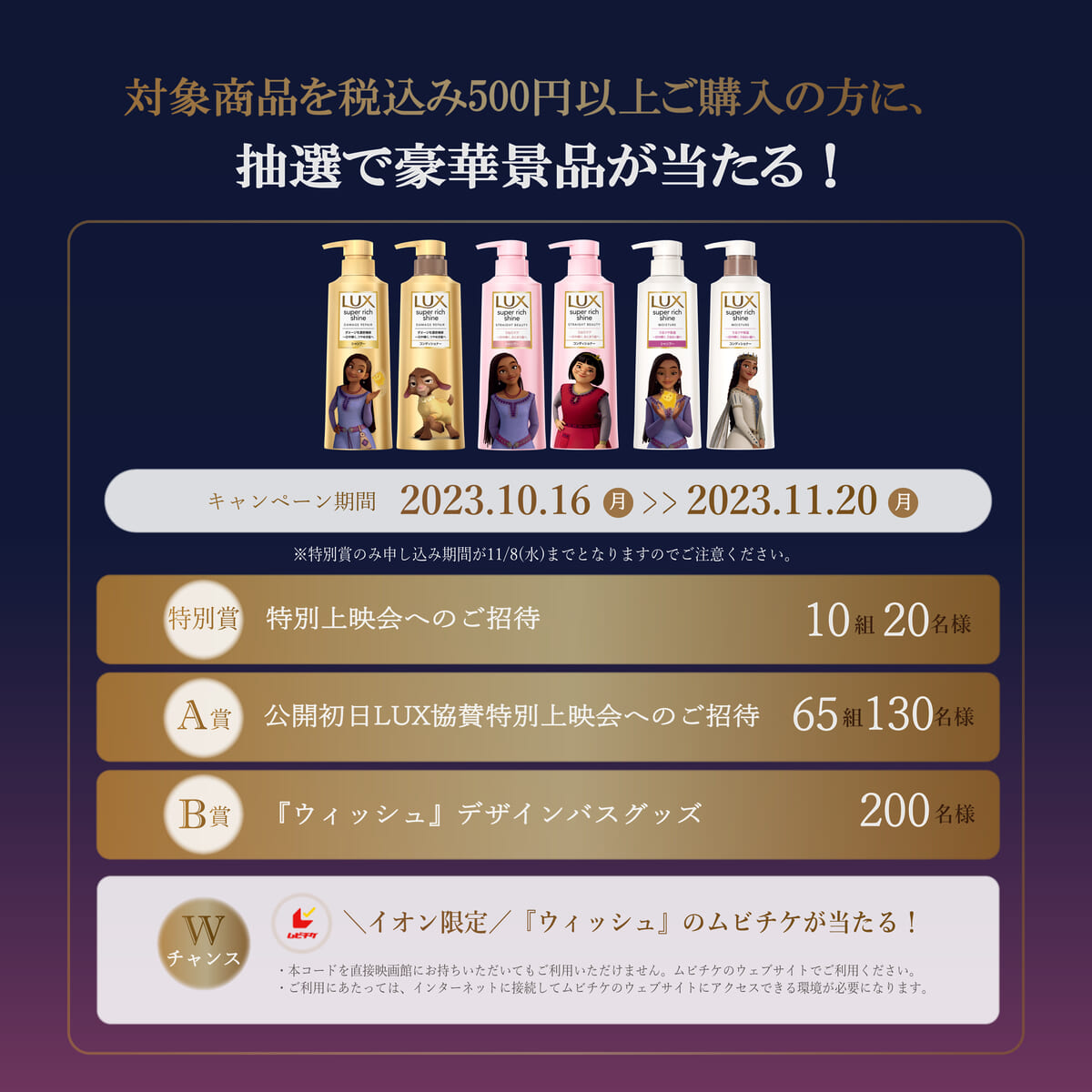 対象製品:ラックス スーパーリッチシャインシリーズ(ディズニー映画最新作『ウィッシュ』限定デザイン品以外のポンプペアを除く)が対象