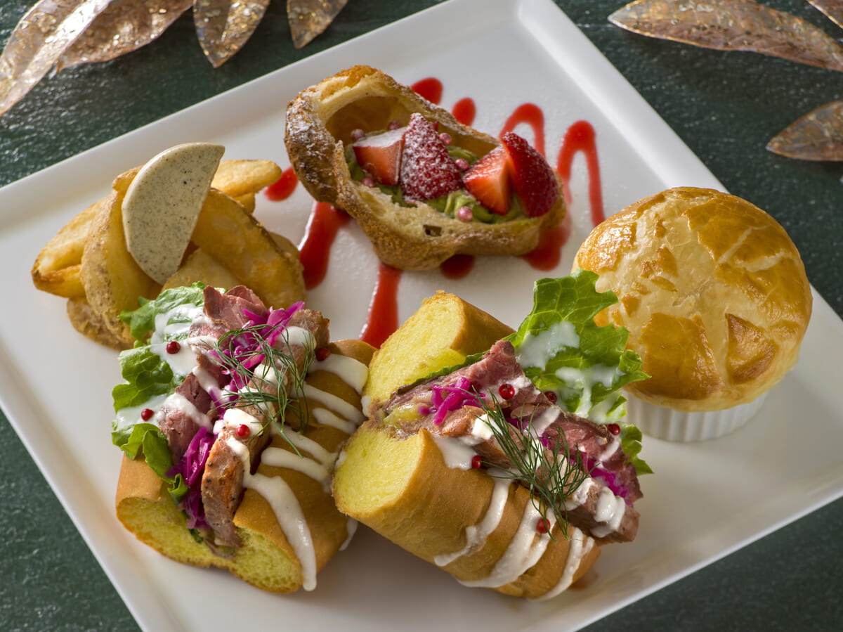 ローストビーフとポークと鶏レバーテリーヌの風味豊かなサンドウィッチは、クリスマスの色合いを表現。