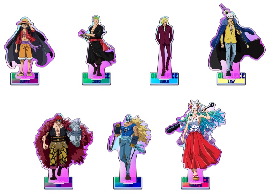 「麦わらの一味」をはじめ「トラファルガー・ロー」や「ユータス・キッド」「ヤマト」たちの堂々とした立ち姿が格好いいグッズです。
