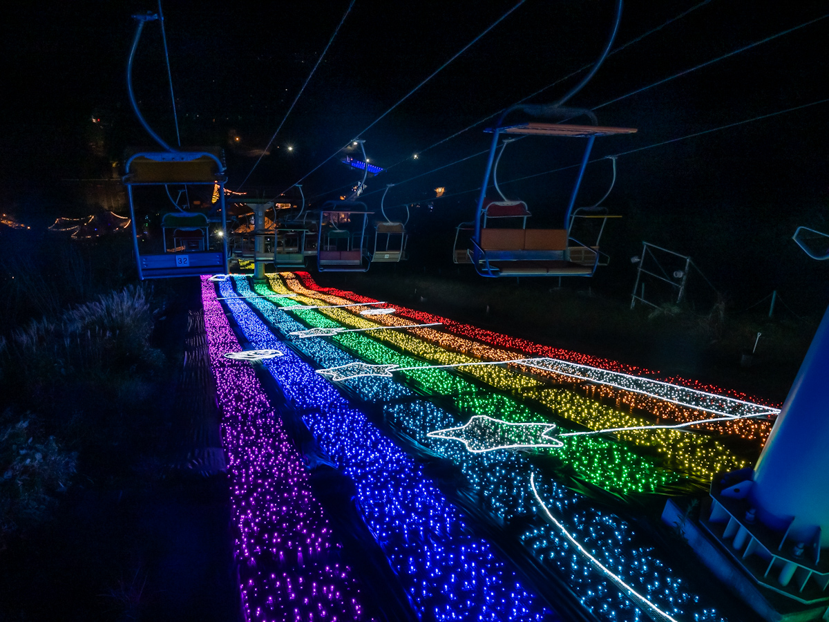 全長250mのリフトに乗ってイルミネーション上空を空中散歩する「虹のリフト」や