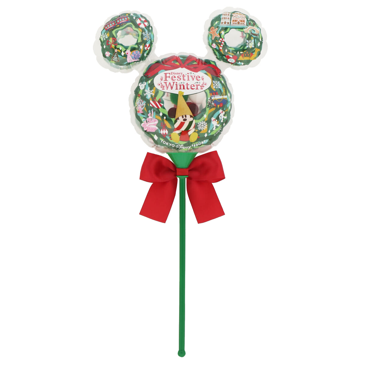 ミッキーシェイプのクリスマスリースをモチーフにした手持ちバルーン。