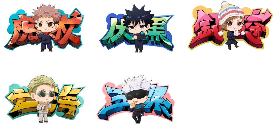 「虎杖悠仁」「伏黒恵」「釘崎野薔薇」「七海建人」「五条悟」がミニキャラになったステッカー。
