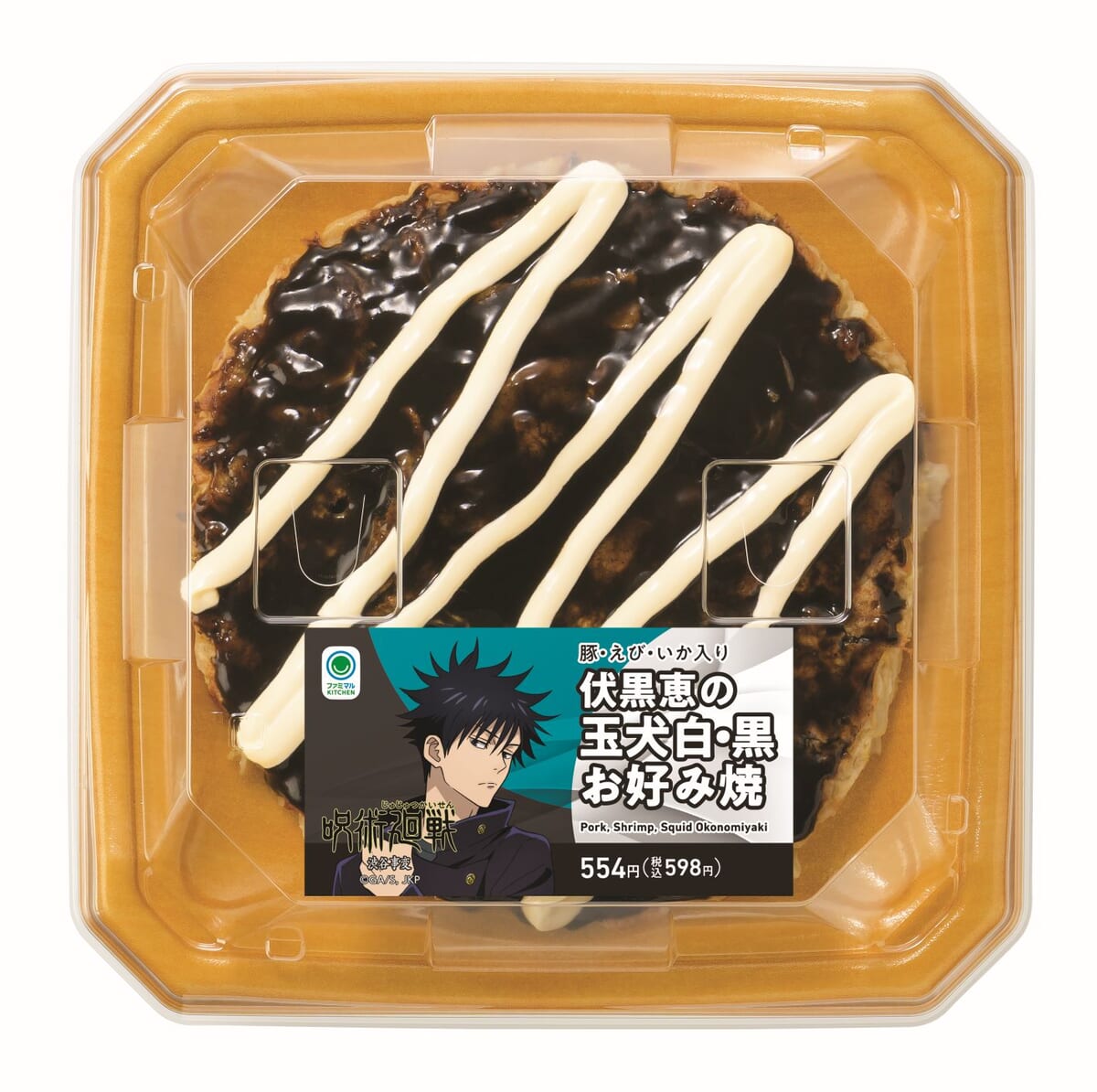 「伏黒恵」が「十種影法術」で召喚する式神のひとつ「玉犬白」「玉犬黒」を、いか墨入りの黒いお好みソースと白いマヨで表現したお好み焼です。