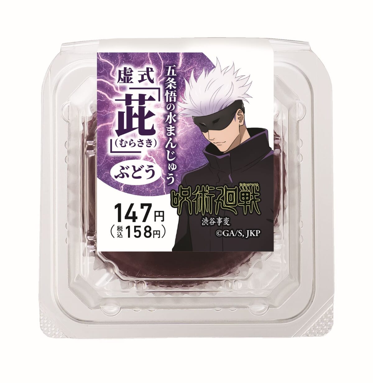 「五条悟」の強力な技である虚式「茈(むらさき)」をイメージしたぶどう餡を包んだ、ぶどう味の水まんじゅうです。