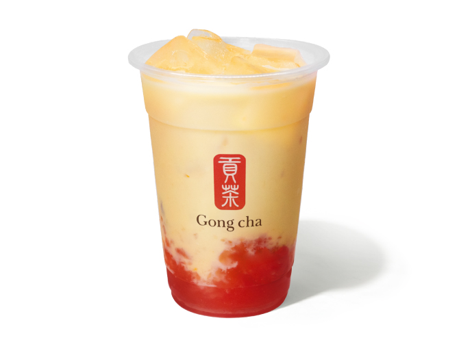 ゴンチャの定番、大人気の果肉入りマンゴーソースとぷるぷる食感のピーチジュレを贅沢に使用したミルクティー。