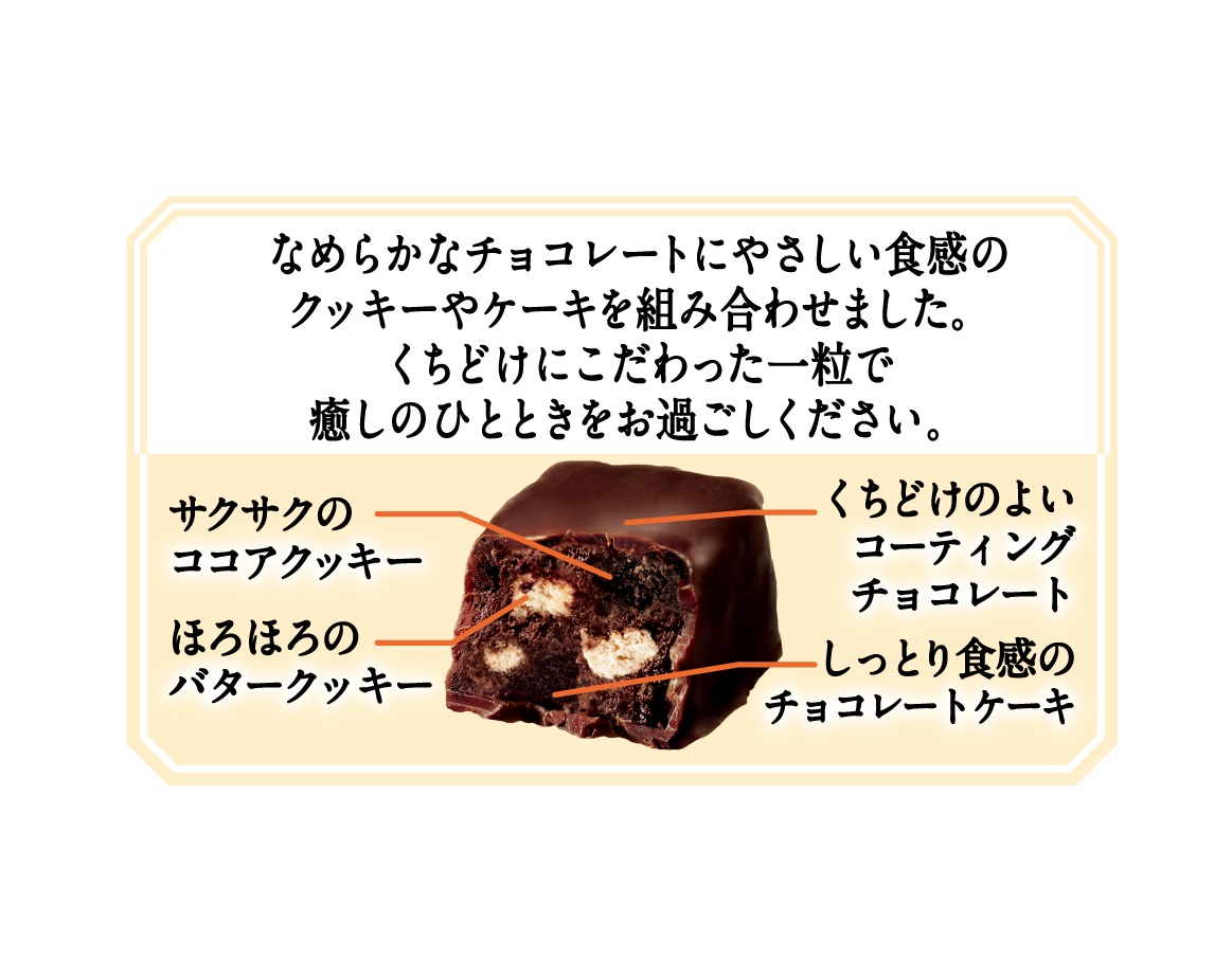 有楽製菓特製のクッキーやチョコレートケーキに、フローラルな香りのなめらかなチョコレートを組み合わせた新商品。