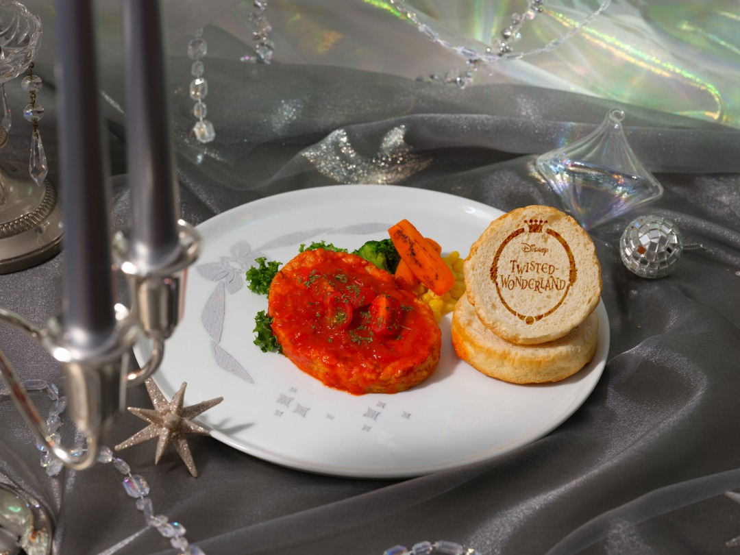メニューは、衣装のリボンモチーフとプリズムのきらめきをステンシルで表現した、トマトソースのハンバーグプレート、サーモンのグリルプレート、鶏むね肉のグリルプレートなど、パーティーをイメージし、コース料理を1枚のプレートに表現したフードメニューが登場。