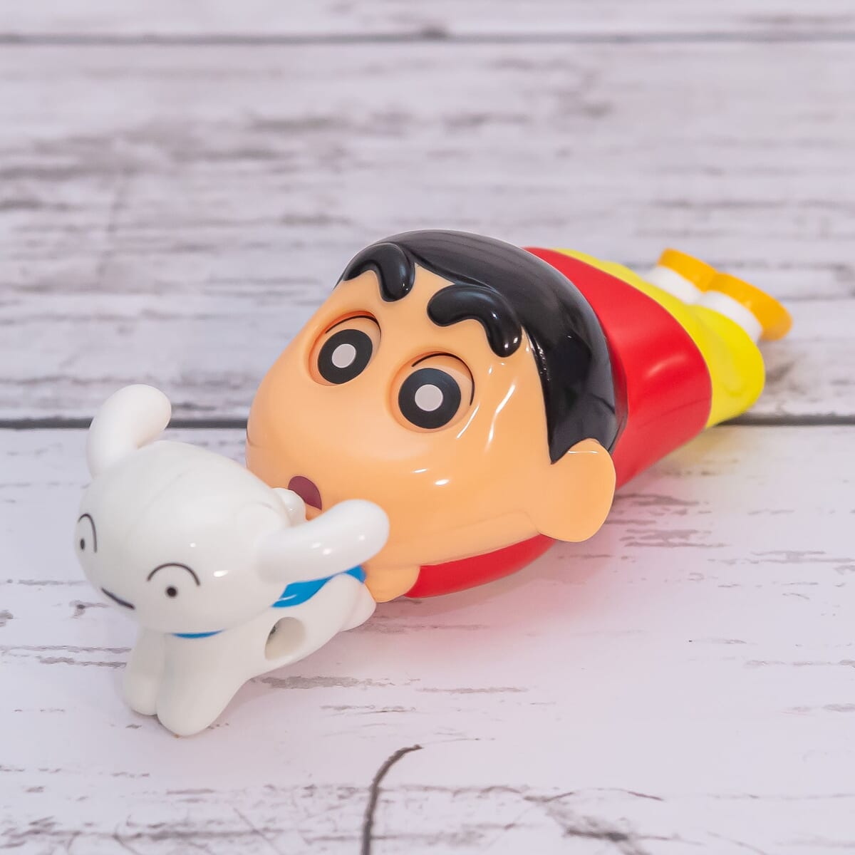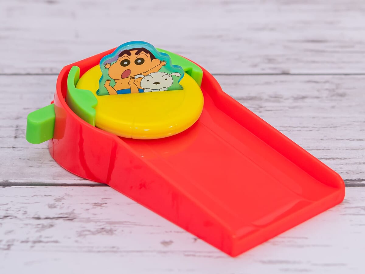 「野原しんのすけ」と「シロ」がウォータースライダーで遊んでいる様子を表現したおもちゃ。