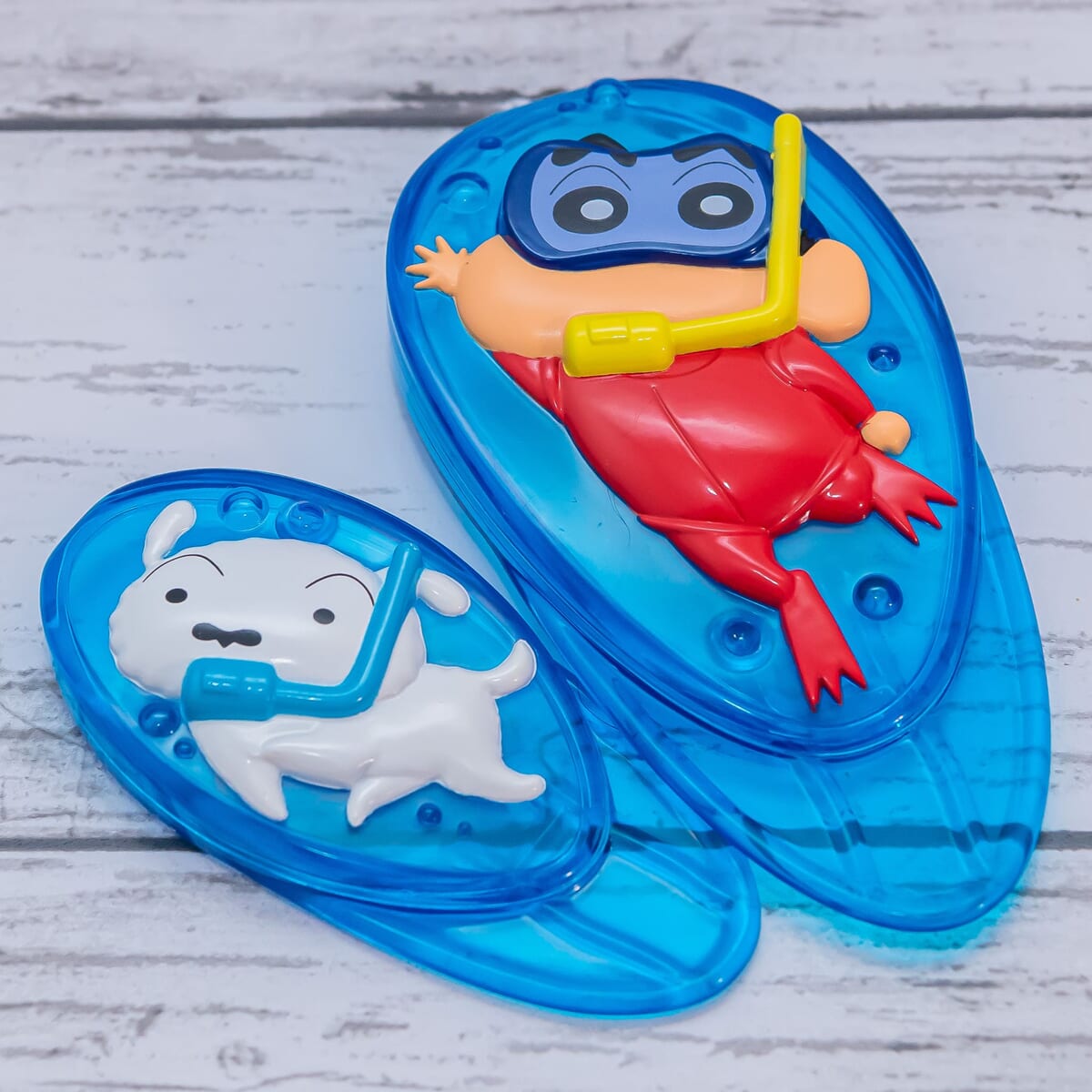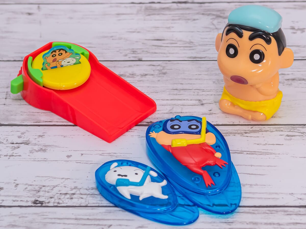 第2弾には、お風呂で遊べる「クレヨンしんちゃん」のおもちゃ3種類をラインナップ。