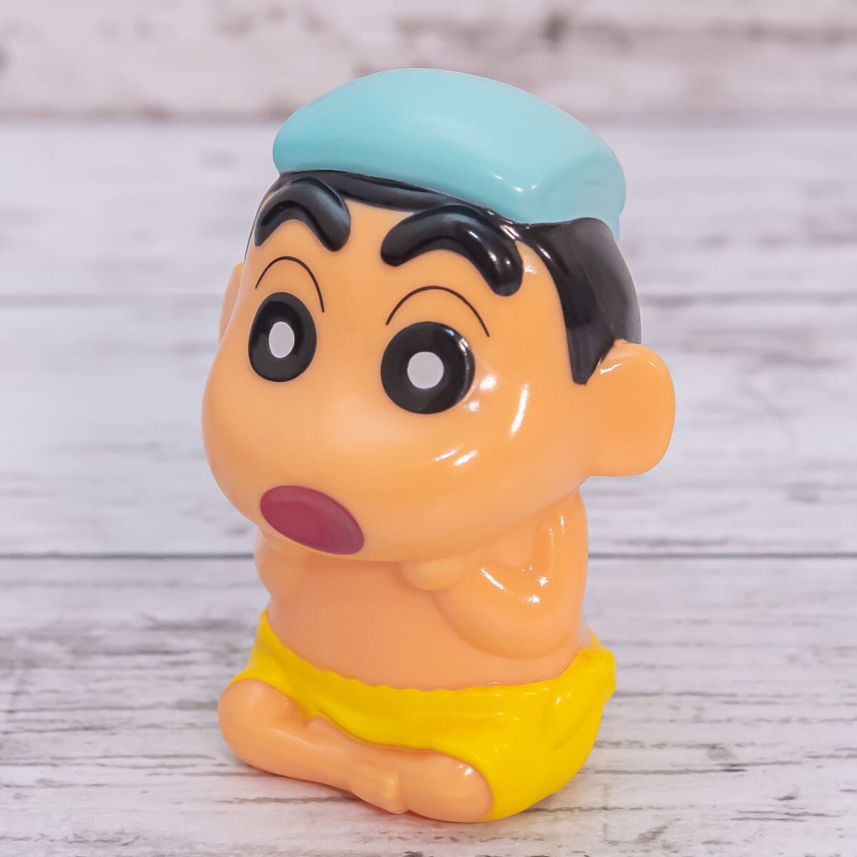 「野原しんのすけ」がお風呂を楽しんでいるようなフィギュアです。