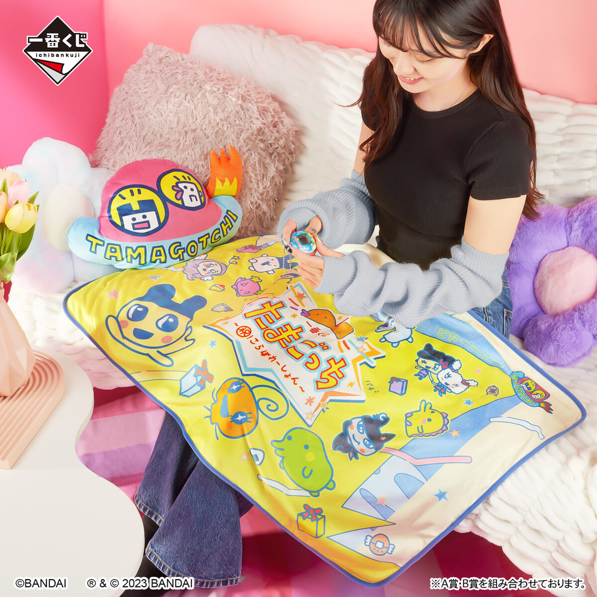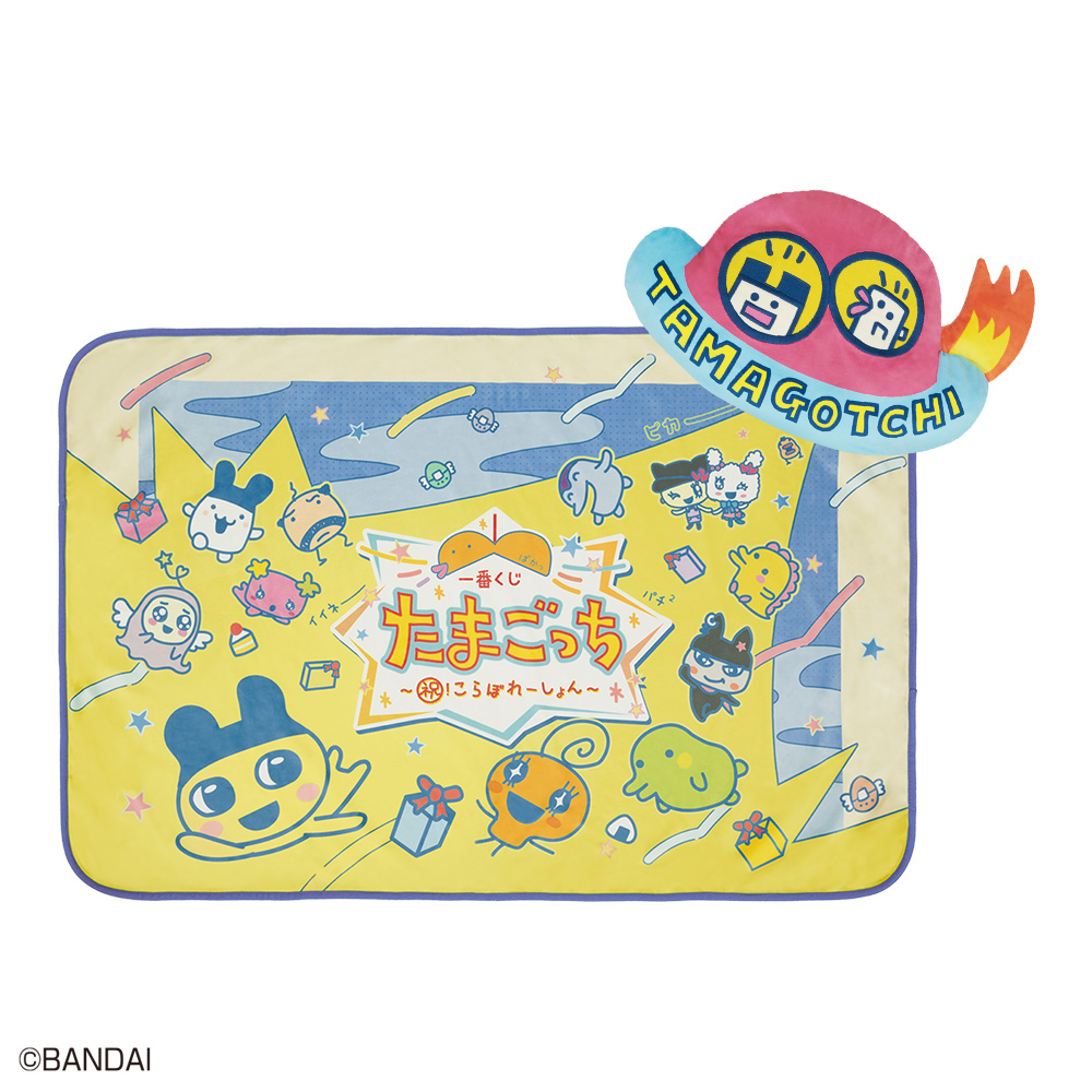 B賞は、ヒュルルンUFOから飛び出してくる「たまごっち」たちを表現したクッションとブランケットのセット。