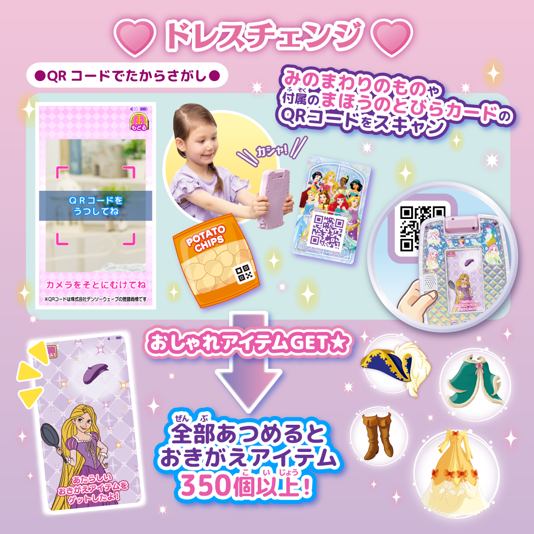 また「QRコードでたからさがし」アプリで、付属のカメラを使い身の周りのものや「まほうのとびらカード」のQRコードをスキャンするとおしゃれアイテムが追加可能。