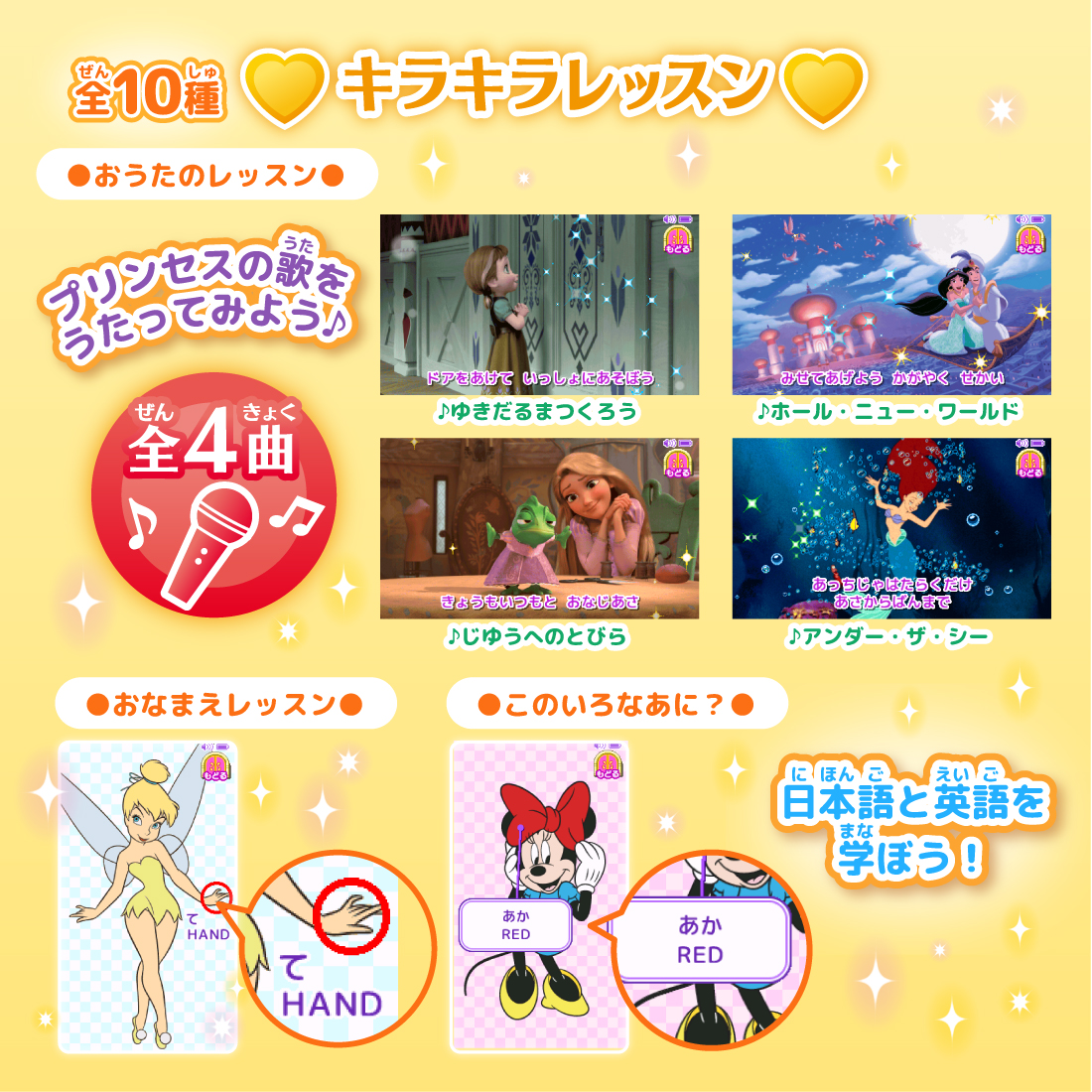 ディズニーの映画楽曲『ホール・ニュー・ワールド』『アンダー・ザ・シー』『じゆうへのとびら』『ゆきだるまつくろう』を使用した「おうたのレッスン」アプリを収録。