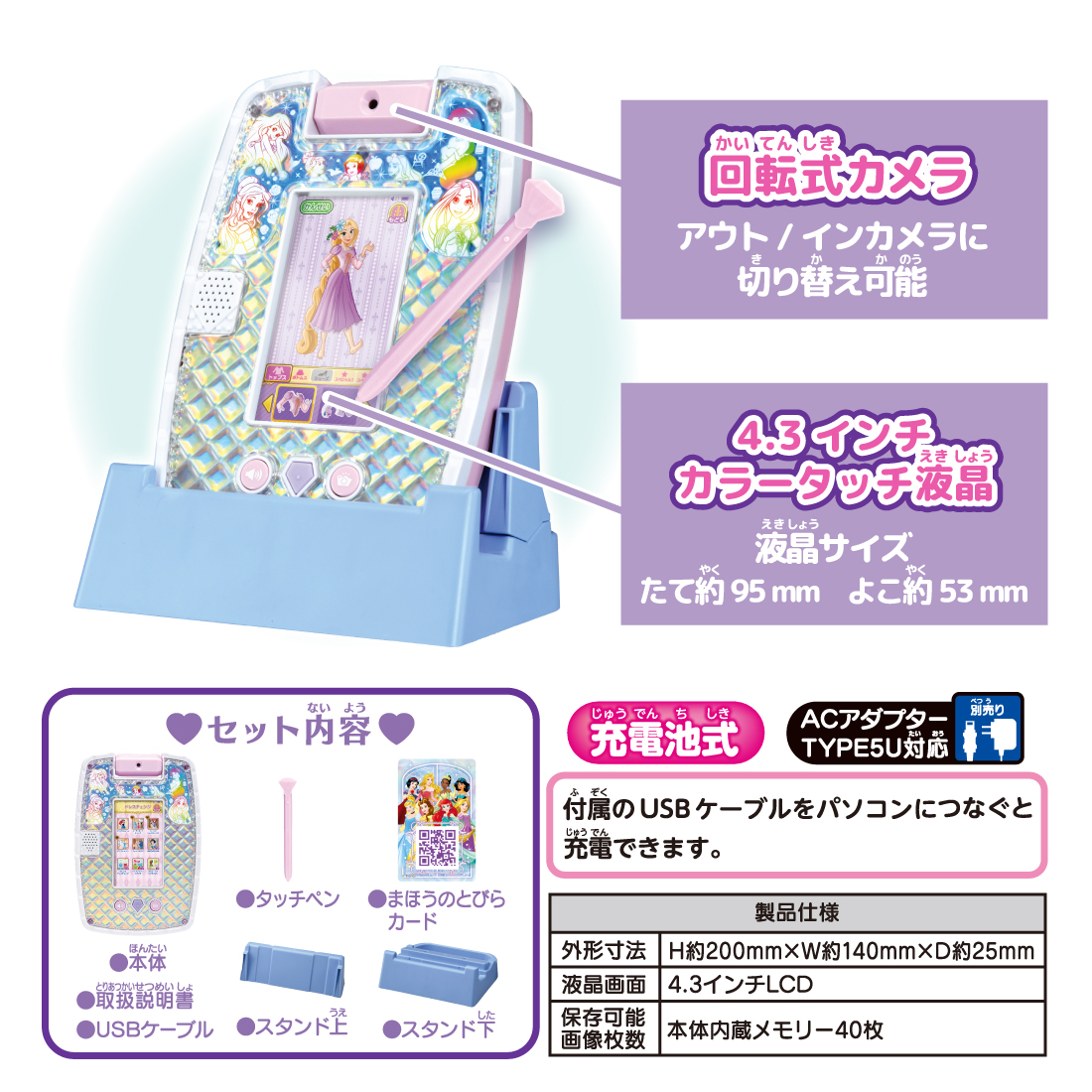 セット内容:本体、タッチペン、スタンド上、スタンド下、USB充電ケーブル、取扱説明書、まほうのとびらカード