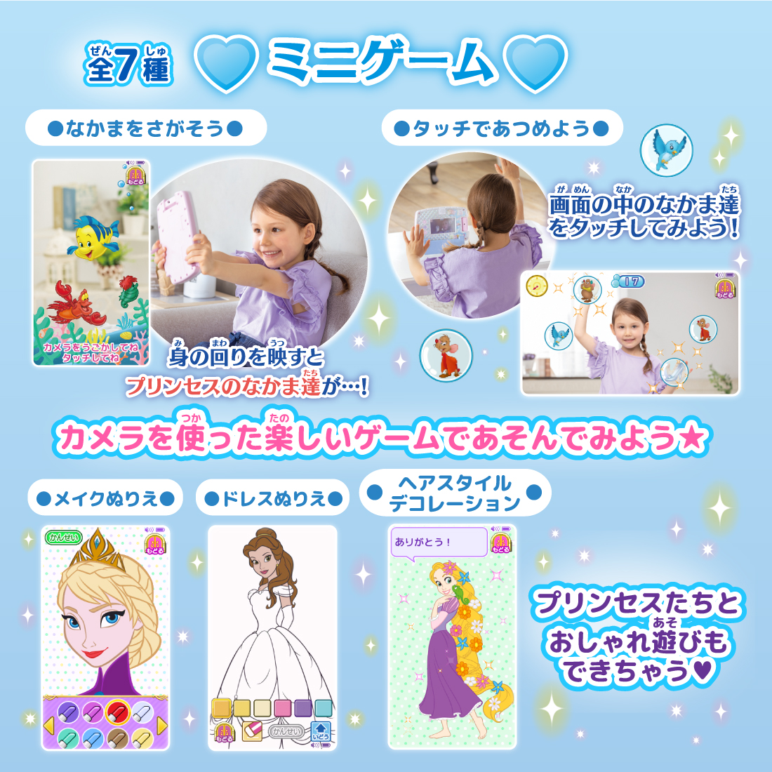 そのほか「タッチであつめよう」「ドレスぬりえ」など様々な遊びができるミニゲームが全7種類収録されています。