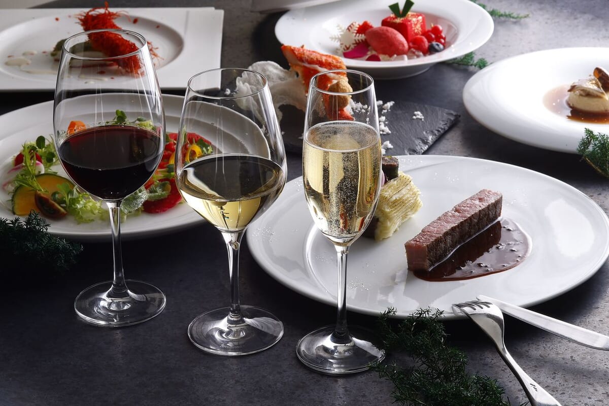 ソムリエがディナーコースのために厳選した、ペアリングワイン3種(シャンパーニュ・白ワイン・赤ワイン)がオプションで登場。