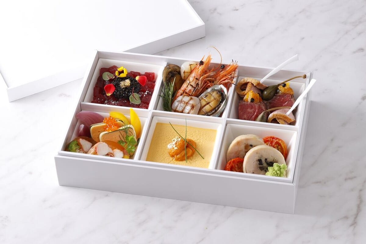 「オードブル バリエ」にはグリルシーフードやガランティーヌ、ビーフや鴨のロースト、雲丹のフランなど8種の前菜を贅沢に詰め合わせられています。