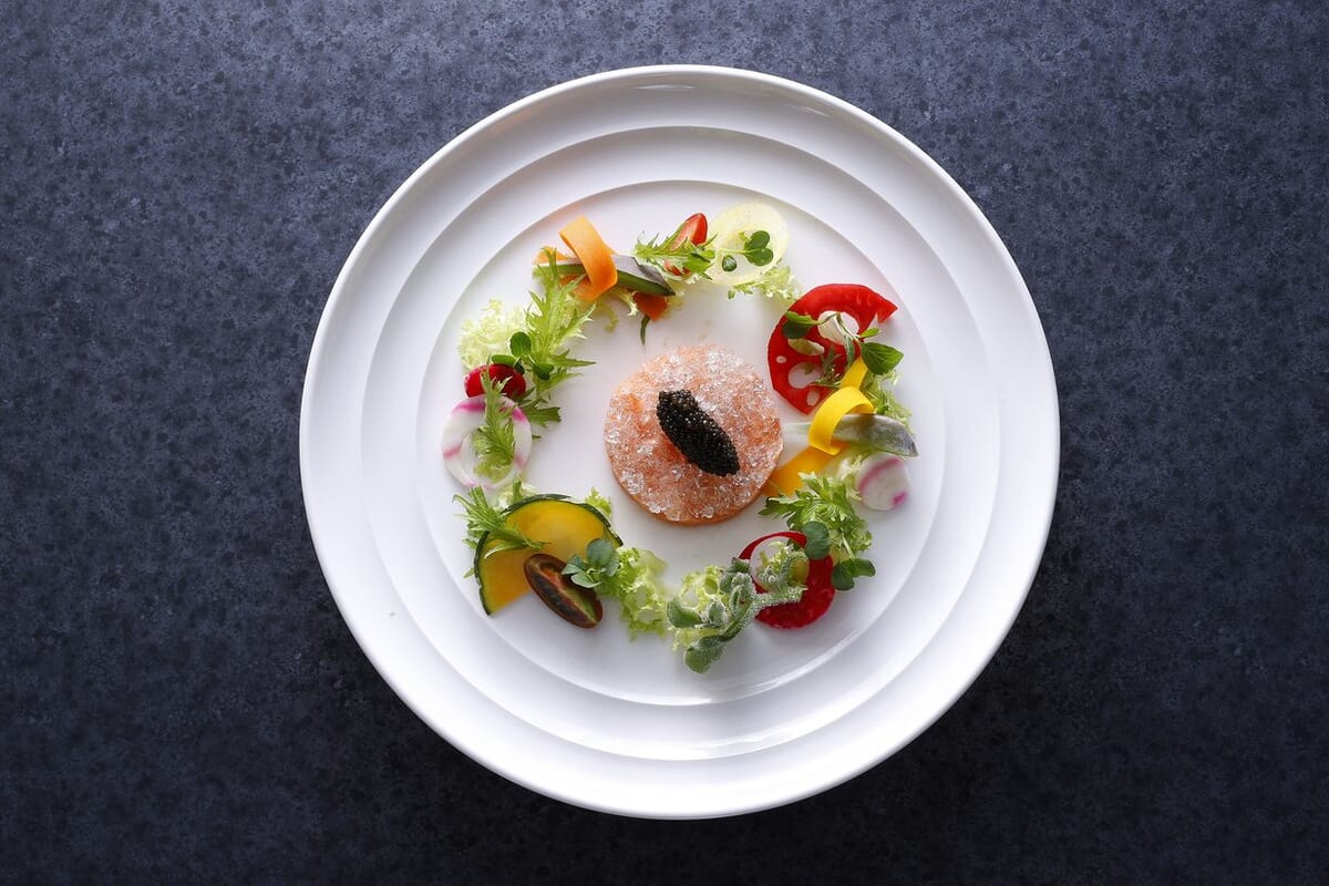 前菜は、山梨県の名水で育った富士の介サーモンと色とりどりの旬野菜を、クリスマスリースに見立てた鮮やかなメニューです。