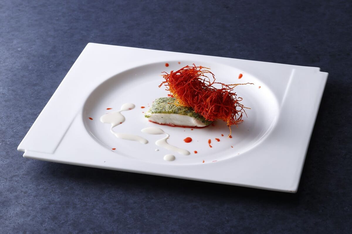 魚料理は、新鮮なオマール海老をさくさくの食感が楽しいカダイフで巻き、ヒラメのソテーと合わせた一品。