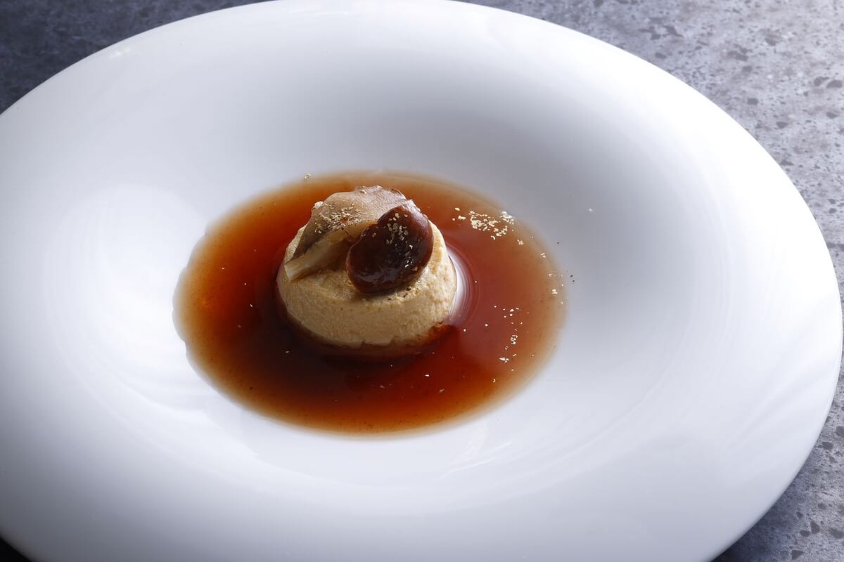 スープはあわび茸の芳醇な香りただようフランを、和牛のコンソメでいただく一品です。