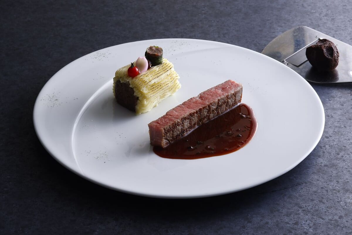 • メインディッシュ 松阪牛サーロインのグリル トリュフソースとフレッシュトリュフの香り ビーフリエットのブッシュドノエル仕立て