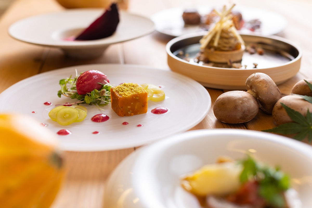 ランチとディナーで楽しめる、鮮やかな野菜とフルーツで収穫の秋のヴィーガンコース。