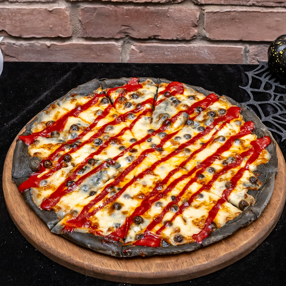 ハロウィン気分を盛り上げる、真っ黒な生地に真っ赤な激辛ブラッディソースをかけたメニュー。