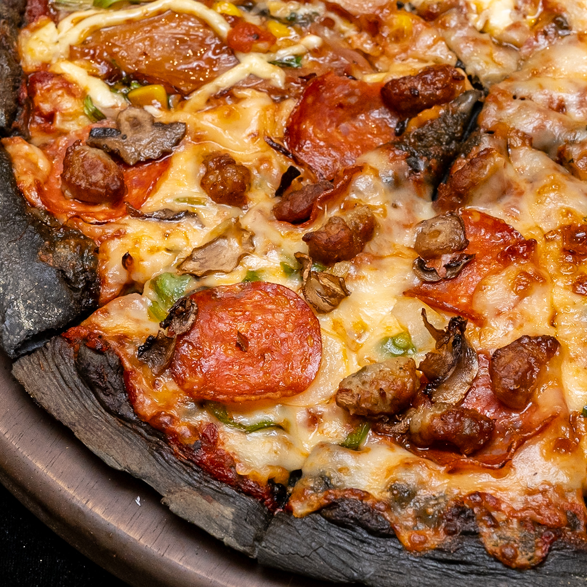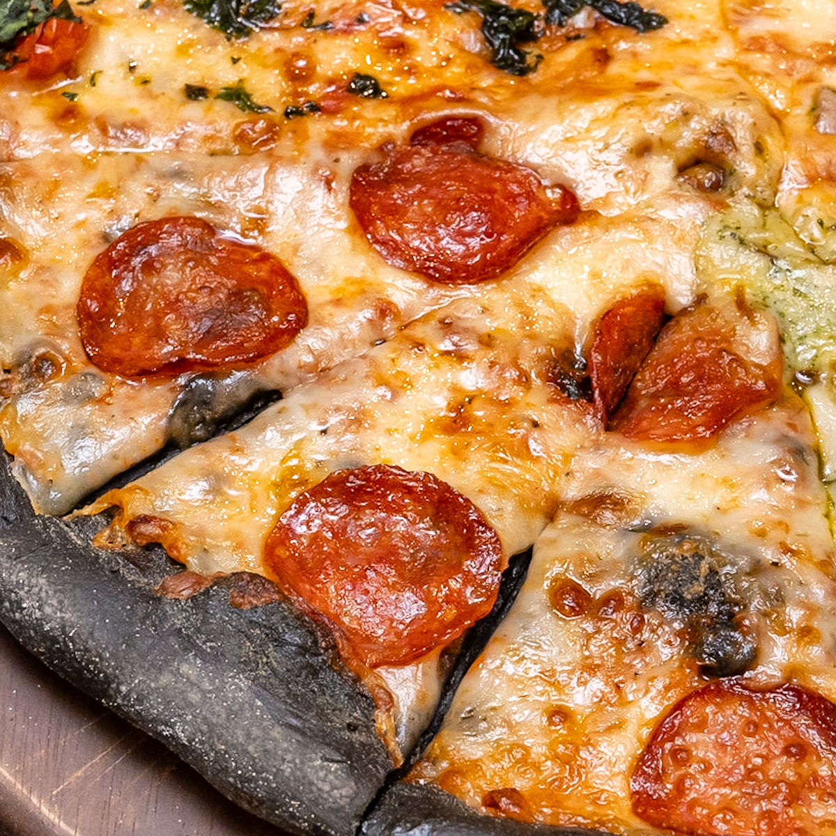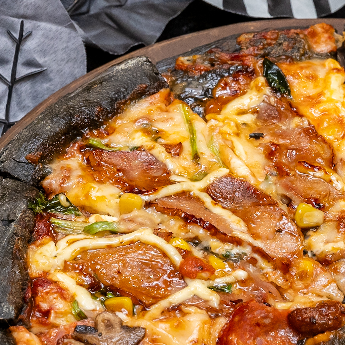 ピザ焼成後も黒色をキープできるよう、竹炭の配合量に試行錯誤を重ねた真っ黒なピザ生地を使ったメニューが、日本のドミノ・ピザに初めて登場します。