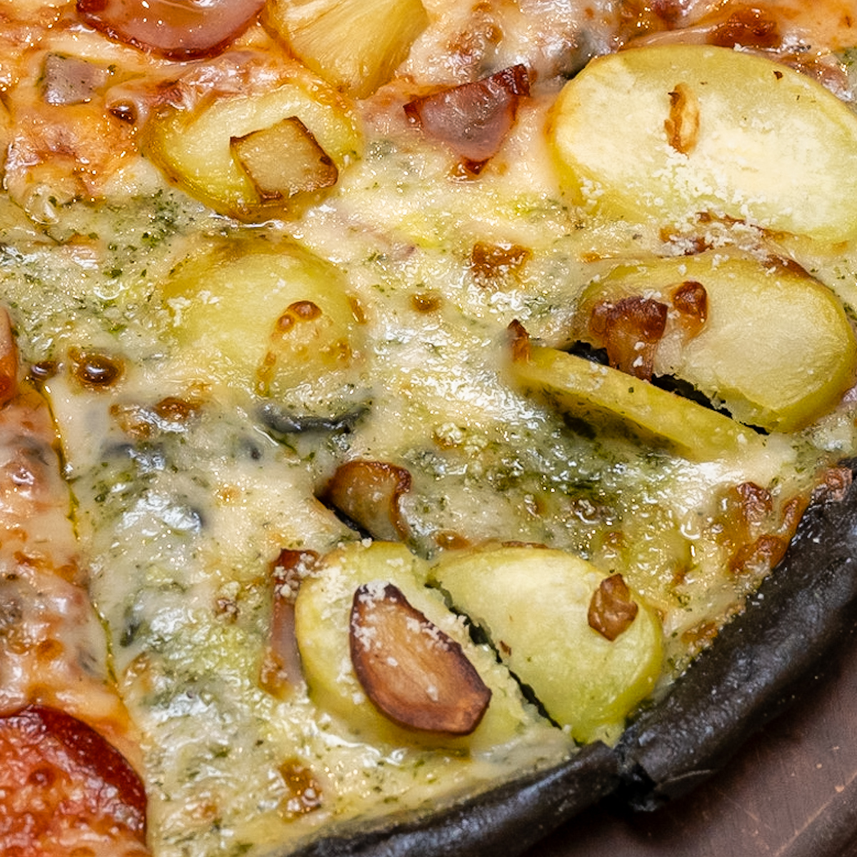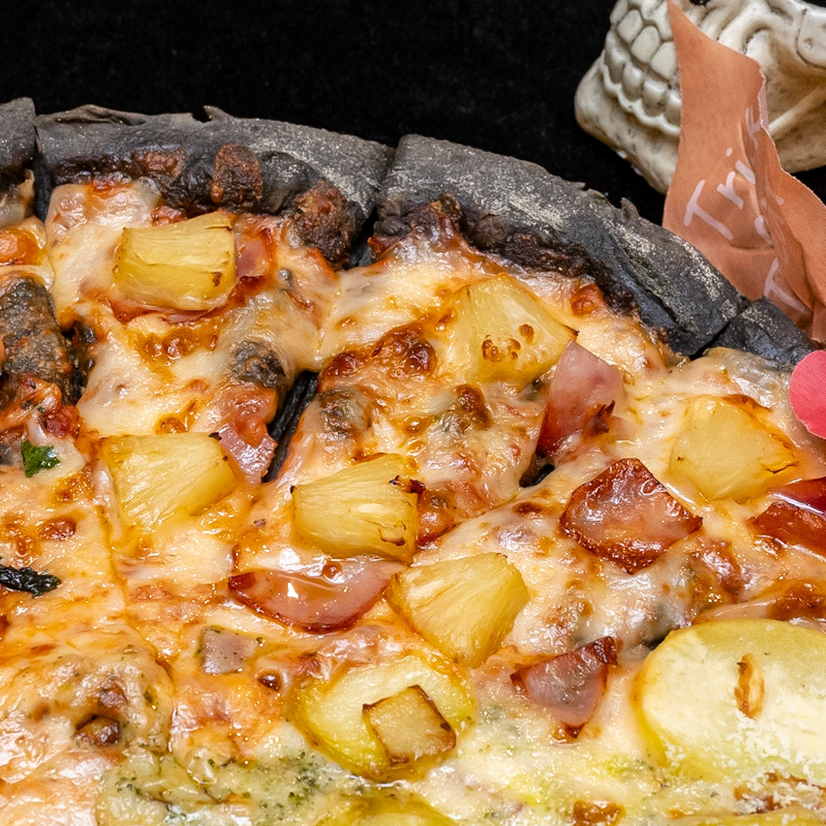 竹炭を混ぜ込んでつくった真っ黒なピザ生地の上にハム、パイナップル、トマトソースをのせた「トロピカル」と、