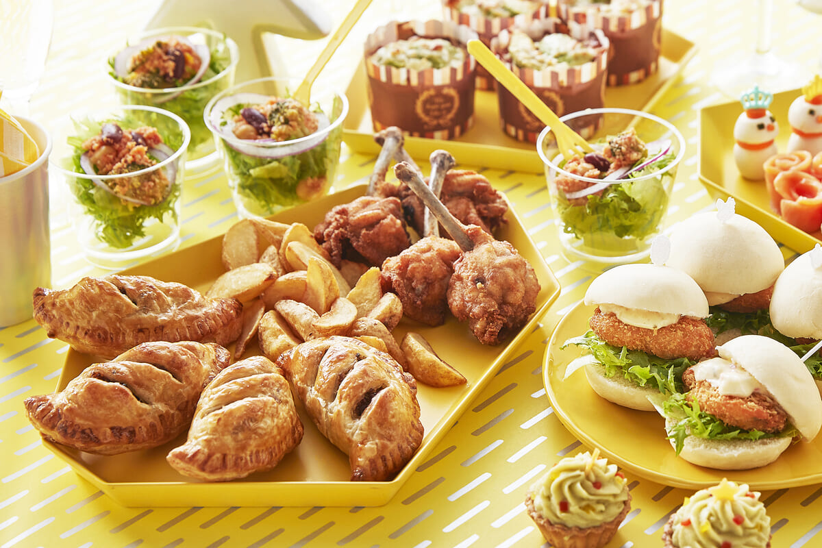 メニュー:アボカドポテトのクリスマスツリー、うずら卵の雪だるま、サンタのカプレーゼ、サーモンと海老のテリーヌ、ミートパイ、チューリップのフライドチキン、ホワイトバンズのバーガー(白身魚のフライとタルタルソース)、スモークサーモンなど15 種のメニューとスパークリングワイン1本(2名利用時はハーフボトル、3~4名利用時はフルボトル)