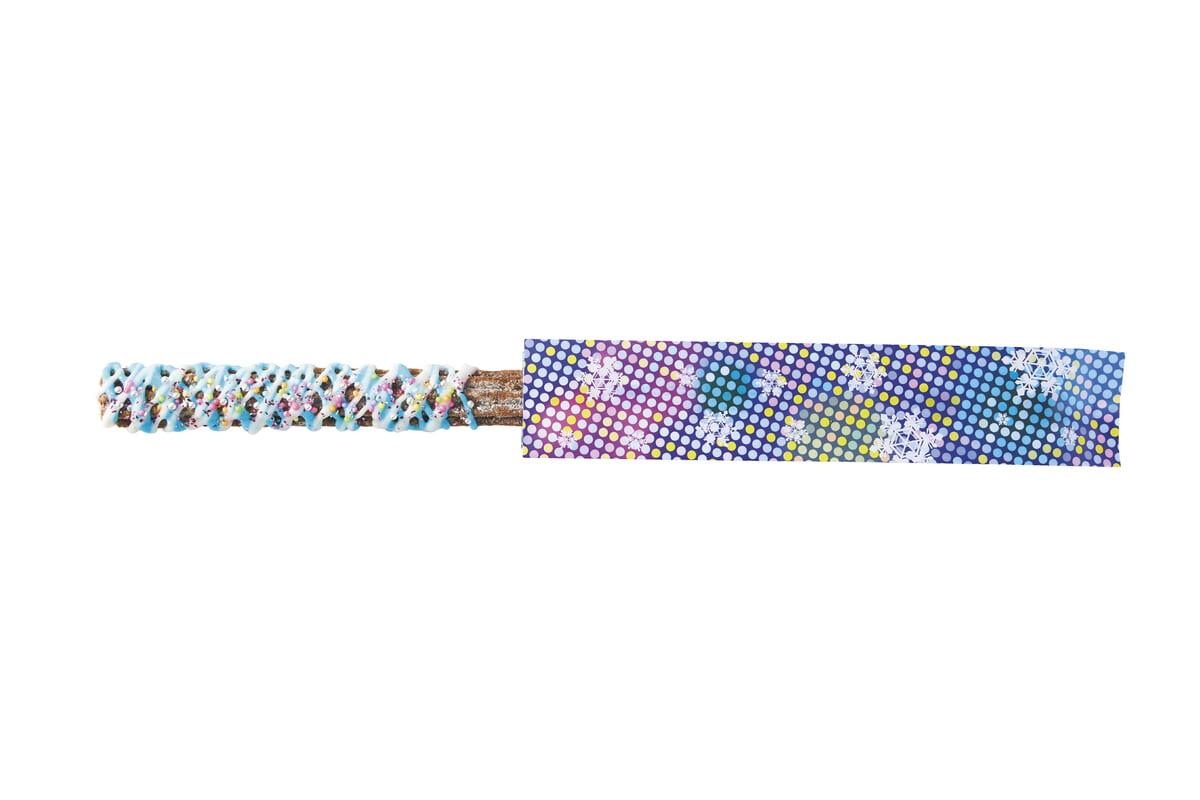 チュリトスには、ブルーとホワイトのチョコレートを線がけし、その上にアラザンなどをトッピング。