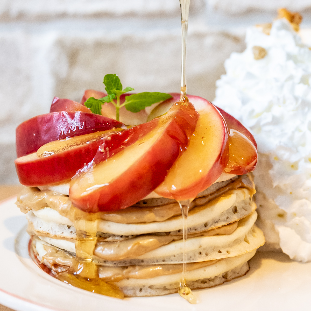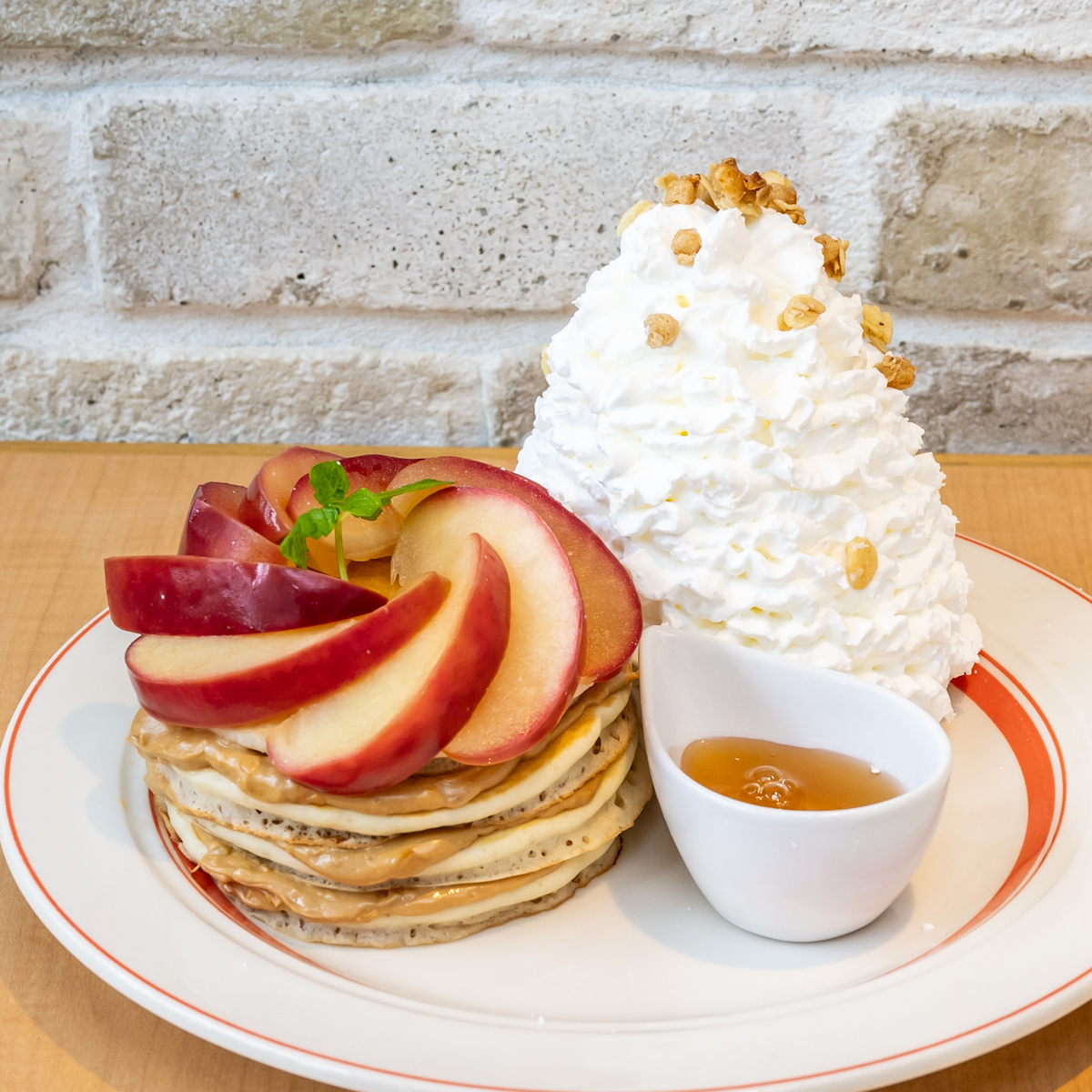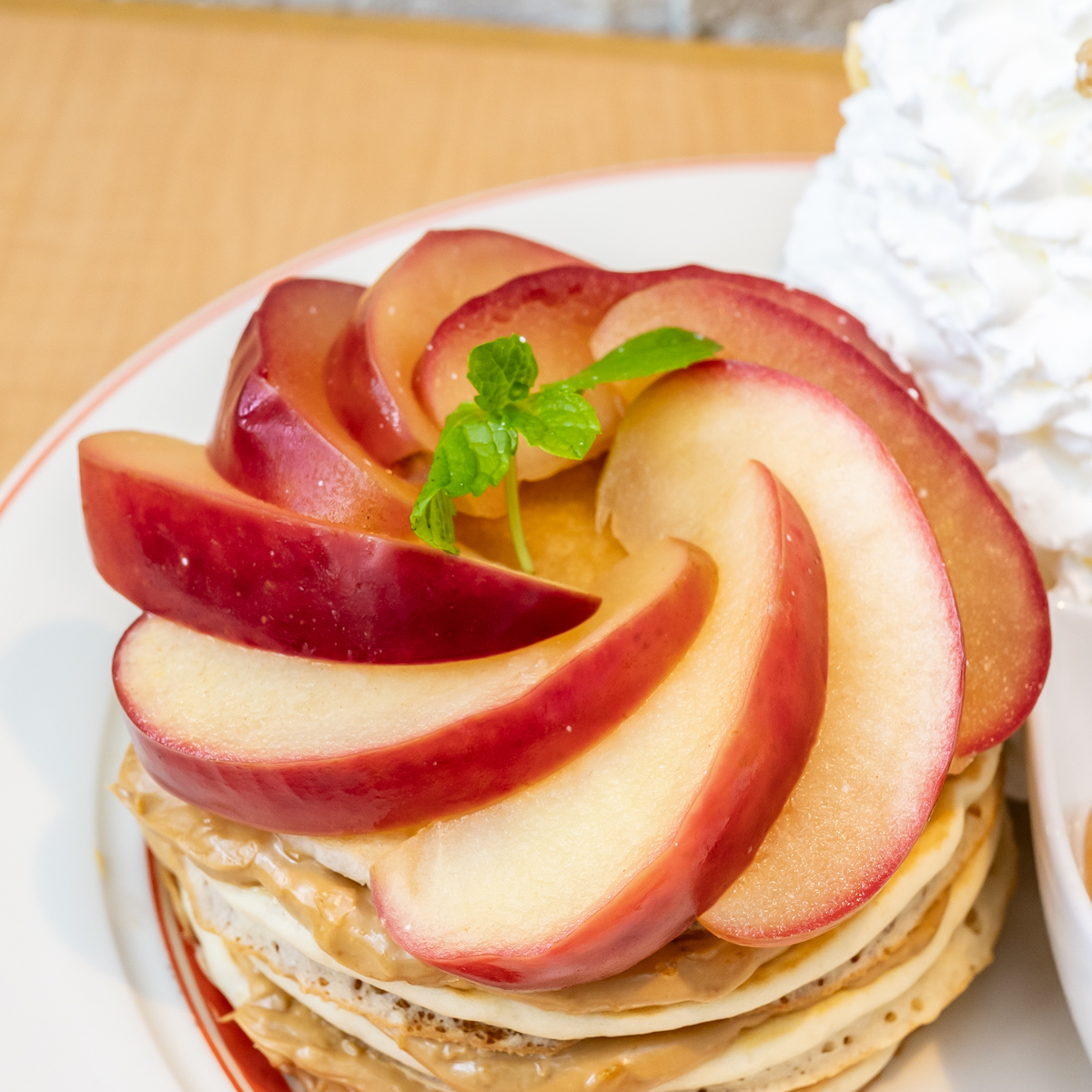 「リンゴとキャラメルのパンケーキ」は、香り高いリンゴのコンポートとサクッとしたキャラメルクリームにふわもち食感のパンケーキが相性抜群の一皿です。