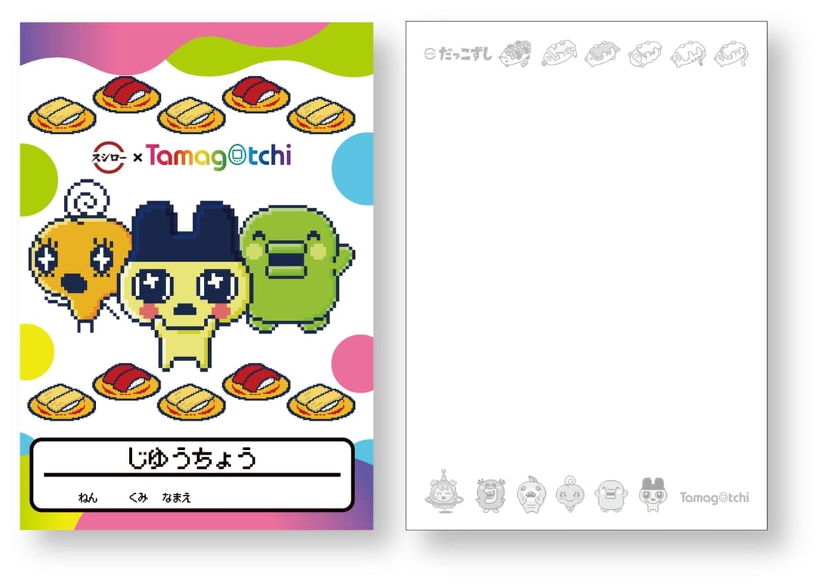「スシロー×たまごっち」のコラボを記念し「キッズスタンプカード」のキャンペーングッズに数量限定でコラボオリジナルデザインを使用したミニサイズの自由帳が登場。