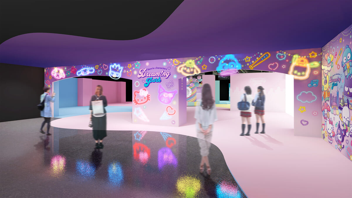 サンリオのキャラクターたちがネオンで描かれた色とりどりに光るゲートをくぐると、目の前に不思議な空間が広がります。