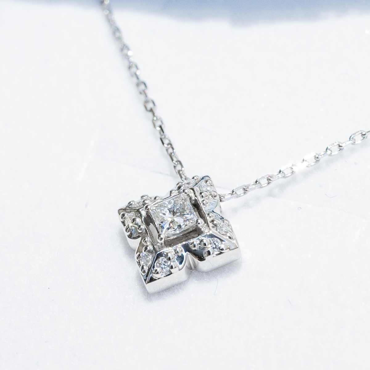 ピュアで瑞々しい印象のプラチナと、正統感のあるプリンセスカットダイヤモンドで高貴な美しさを表現したネックレスもおしゃれ。