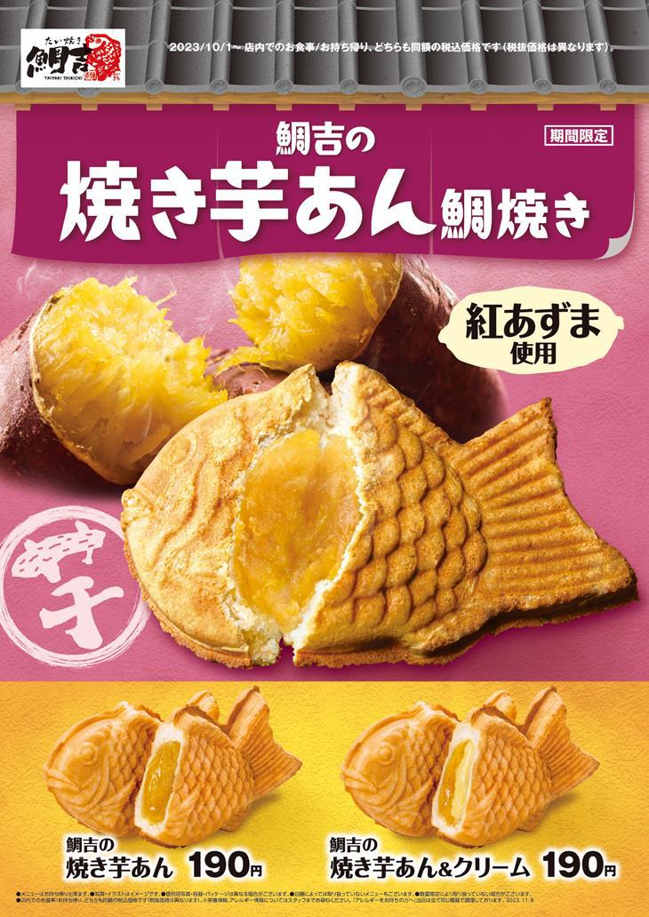 ロッテリアが運営する鯛焼き店「鯛吉」12店舗にて、2023年11月8日(水)から期間限定で「鯛吉の焼き芋あん鯛焼き」が登場!