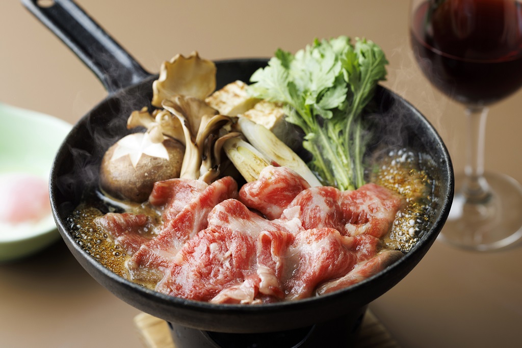 勝沼産赤ワインでコクを深めた割り下を使って楽しむ、すき焼きに仕立てられています!
