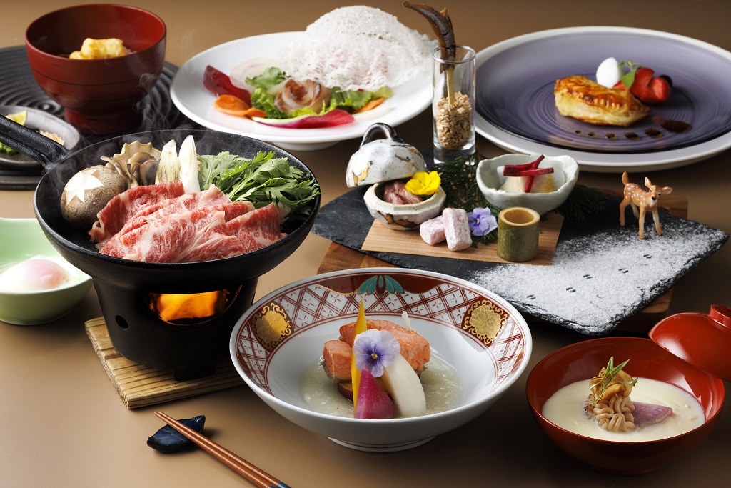 夕食には冬の地元食材を使った料理や郷土料理に、シェフの遊び心を取り入れた和洋折衷の逸品を盛り込んだディナーコースが提供されます。