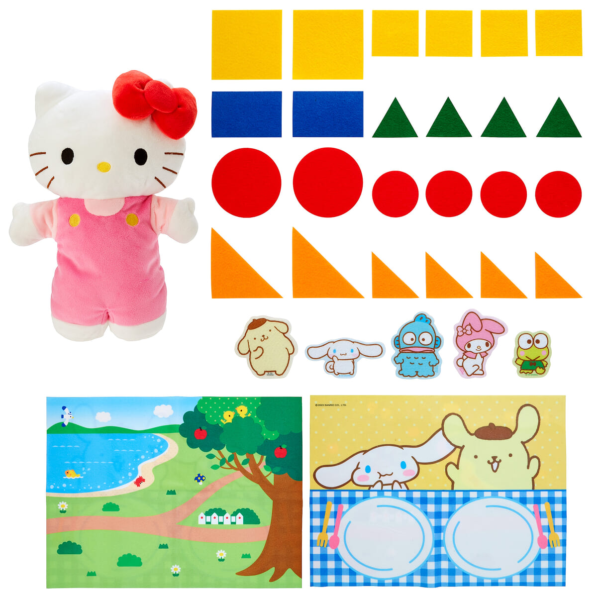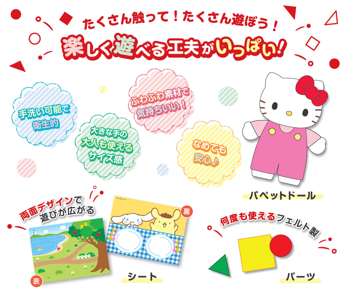「ハローキティ」や「ポチャッコ」のパペットドールと、丸、三角、四角のフェルト製のパーツ、遊びが広がるデザインが入ったシートがセットになっていて、自由な発想でストーリーをつくったり、見立て遊びを楽しめます。