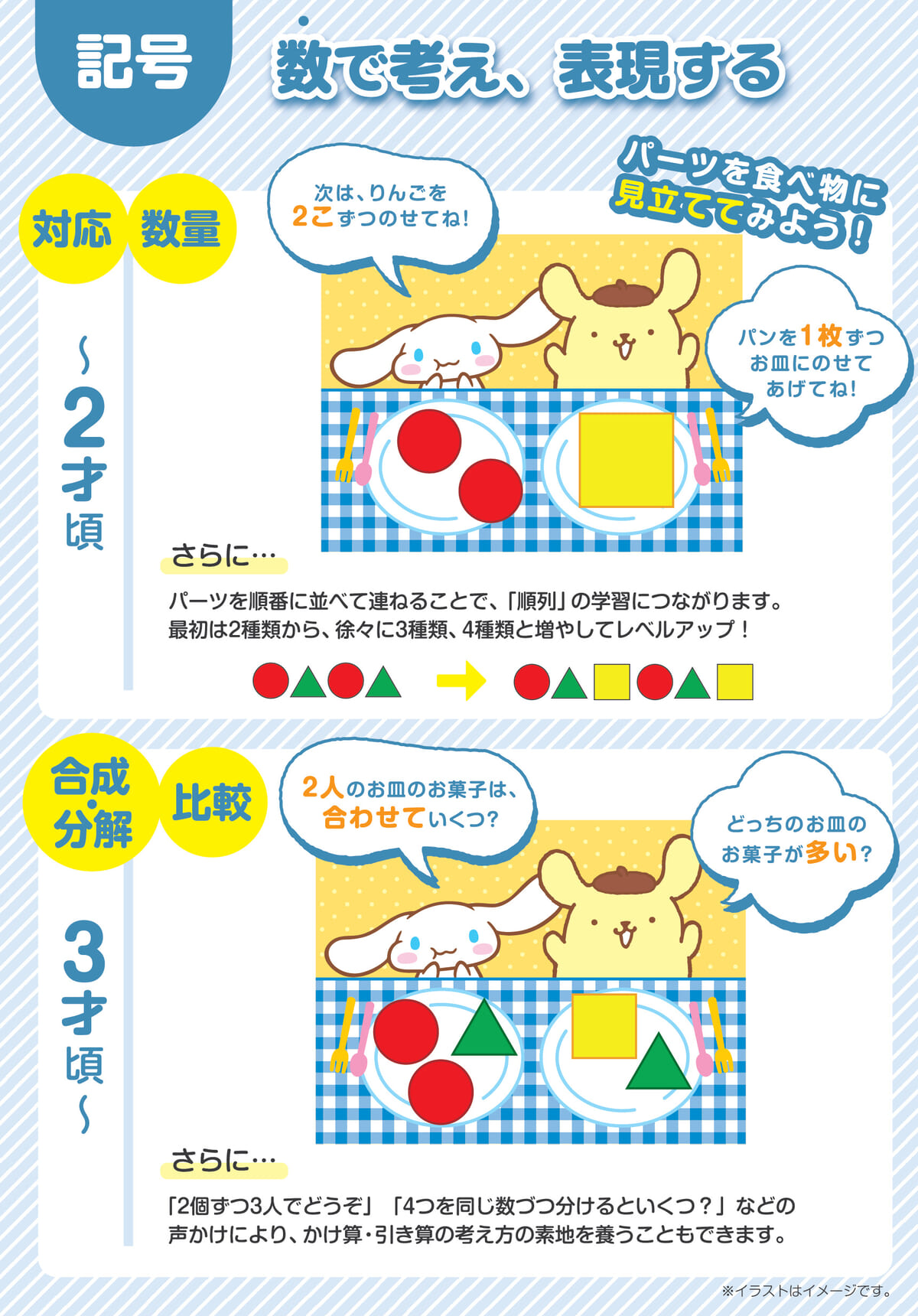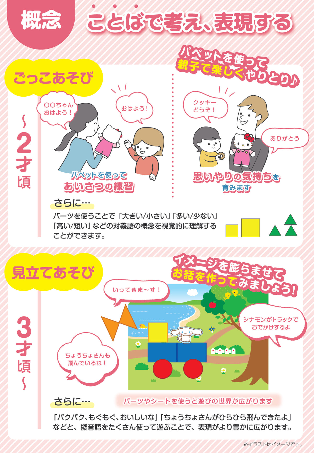 「ハローキティ」や「ポチャッコ」のパペットを使って楽しい雰囲気を作りながら、図形や数などの概念を学べるパネルシアターやパーツを使い、形で考えたり、数で考えたり、ことばで考えたりとさまざまな遊び方ができます。