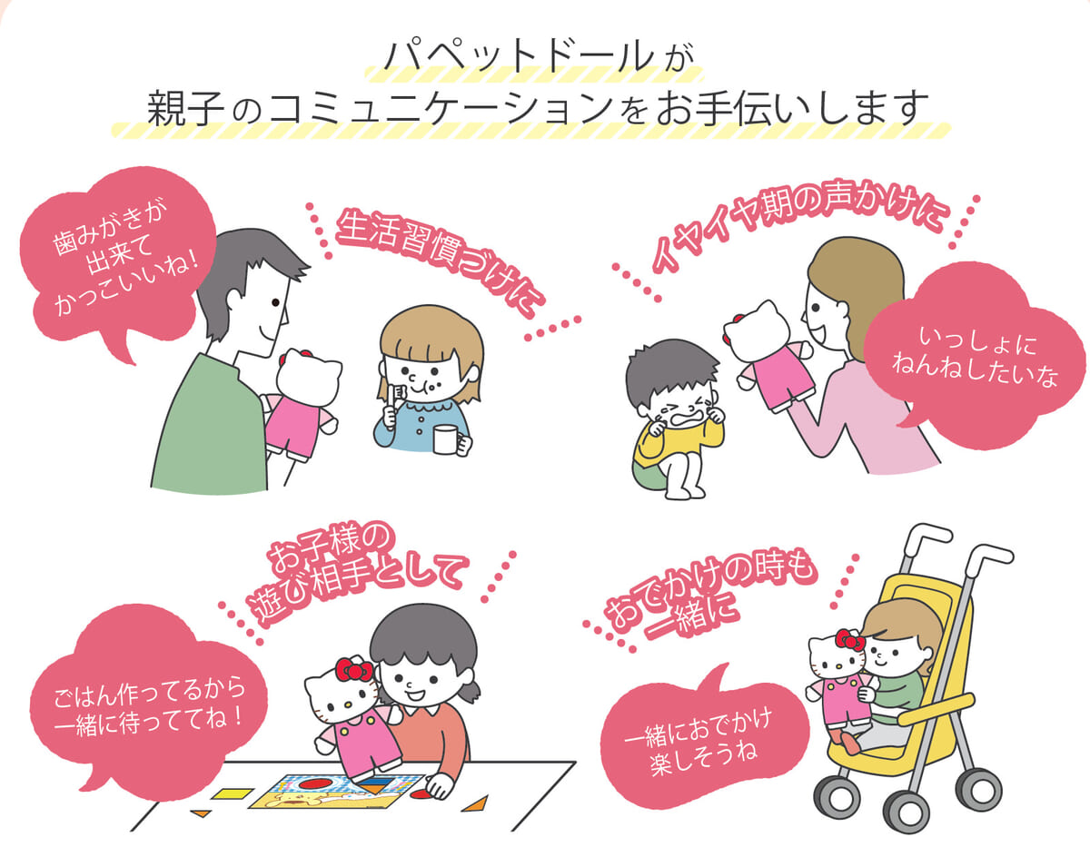 お出かけの際や、生活習慣づけなど普段の生活の中でも、パペットドールが親子のコミュニケーションをお手伝いしてくれます。