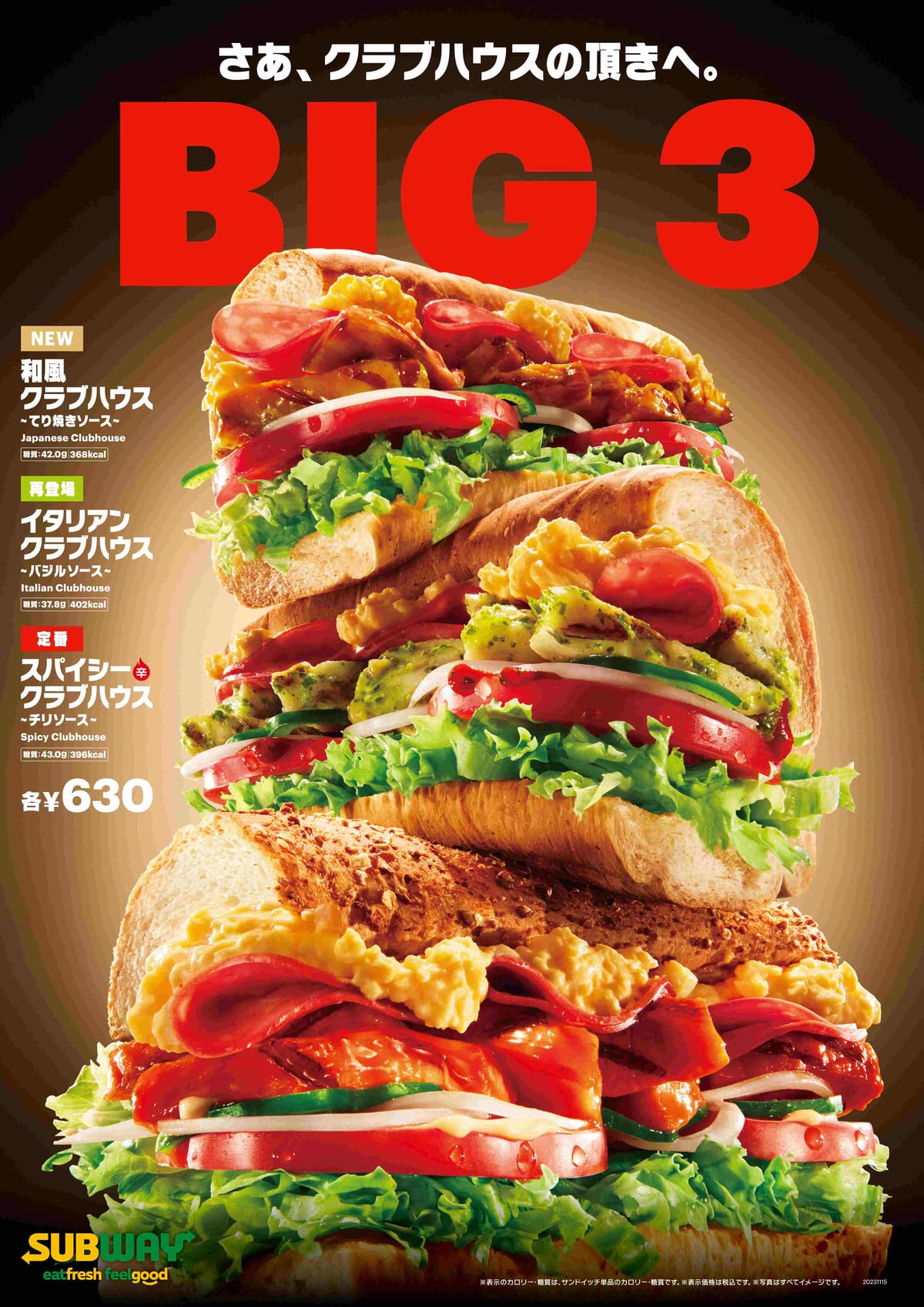 サブウェイ史上最重量のボリューム感を楽しめる「和風クラブハウス~てり焼きソース~」「イタリアンクラブハウス~バジルソース~」「スパイシークラブハウス~チリソース~」が販売されます。