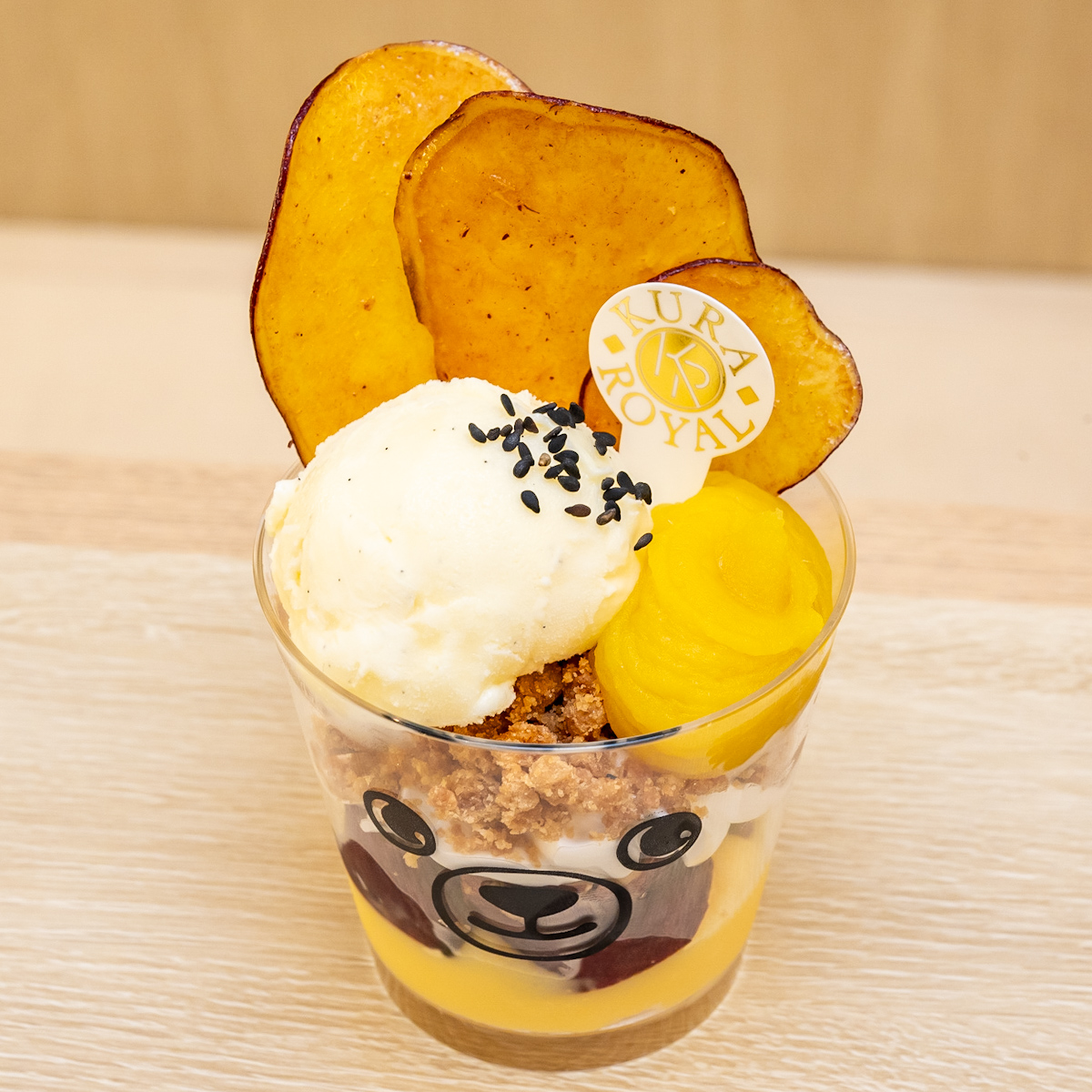 トッピング:(上から順に)芋チップ、黒ゴマ、芋フィリング、バニラアイス、クランブル、ホイップ、焼き芋(カット)、カスタードクリーム