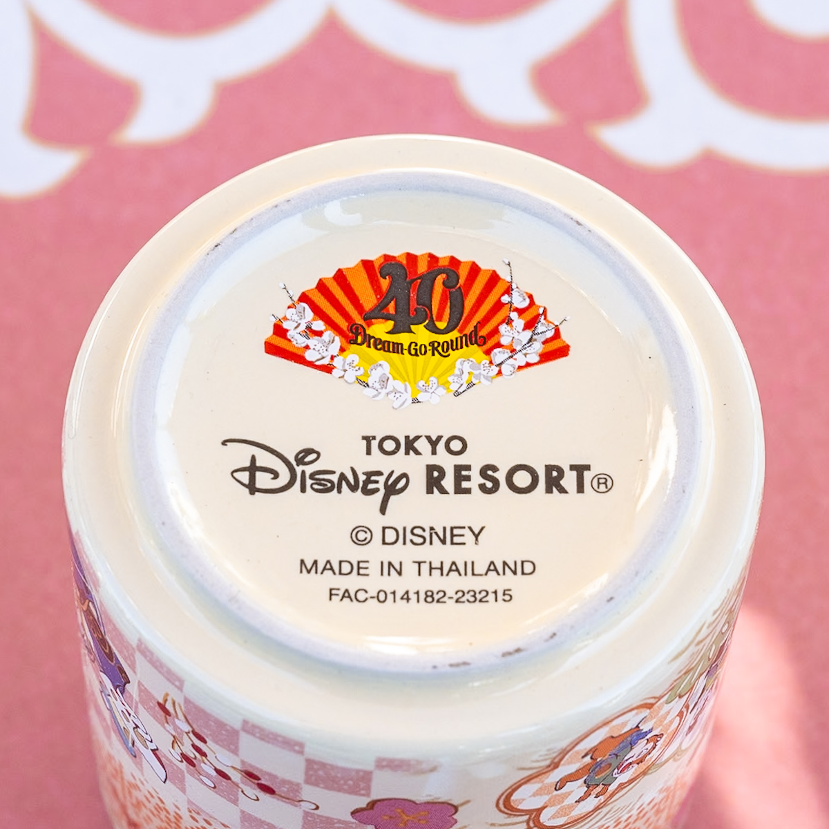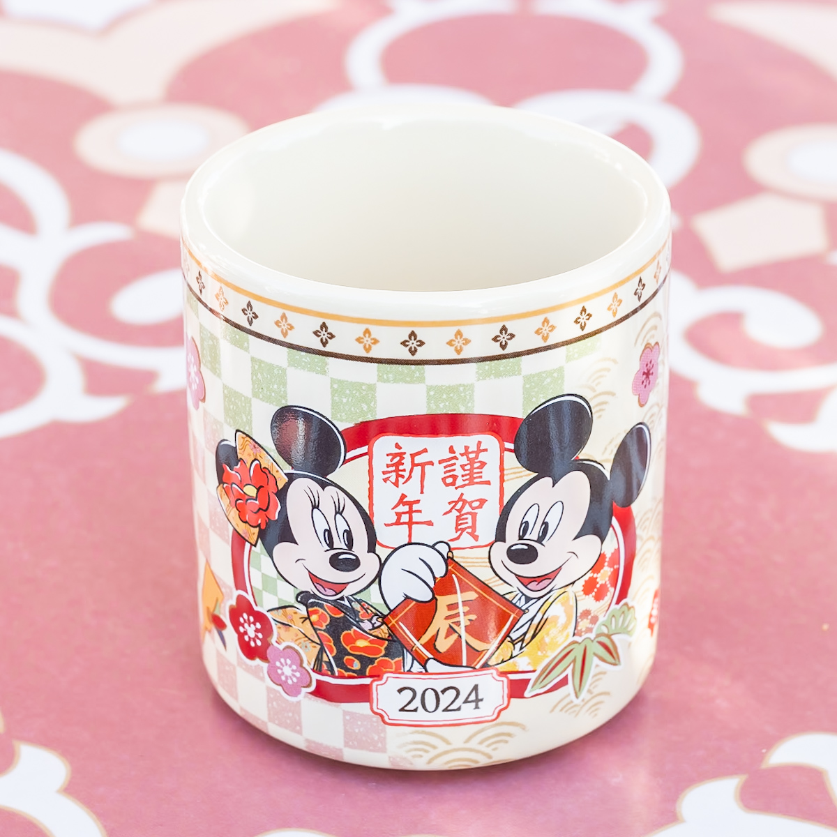 和服姿の「ミッキー&フレンズ」や「ムーシュー」たちが描かれた湯呑型のスーベニアカップ。