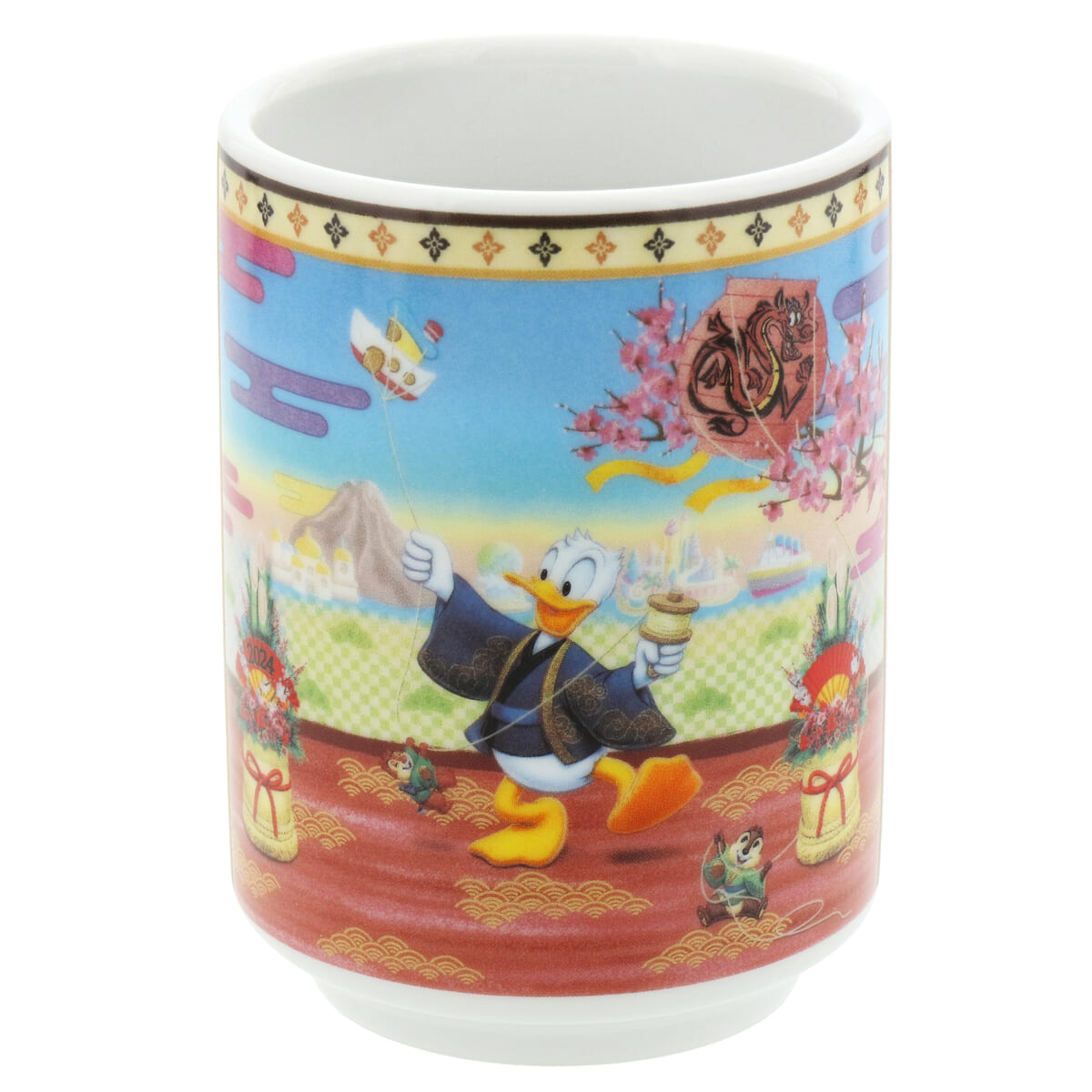 和服姿で凧あげを楽しむ「ミッキー&フレンズ」デザインの湯のみ。