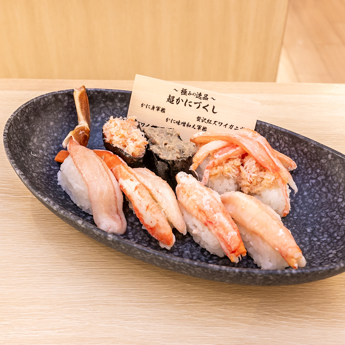 「贅沢紅ズワイガニ盛り」は、紅ズワイガニのフレークと棒肉をシャリからはみ出るほどふんだんに盛り付けた、見た目にも豪華な一品。